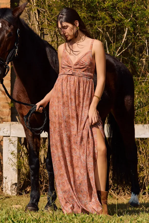 Vestido longo confeccionado em tule leve com estampa Paisley discreta, trazendo um visual romântico com toque boho e cheio de charme. A peça possui forro interno, garantindo conforto e segurança, além de alças finas reguláveis que proporcionam o ajuste ideal ao corpo.