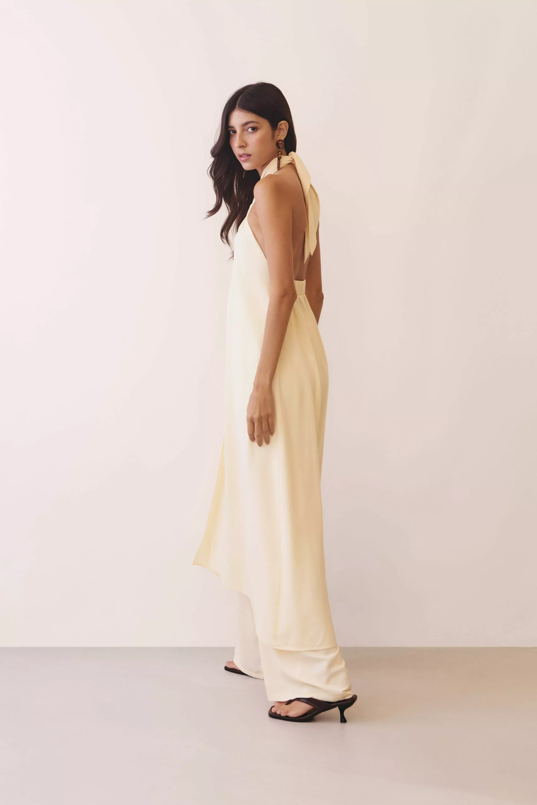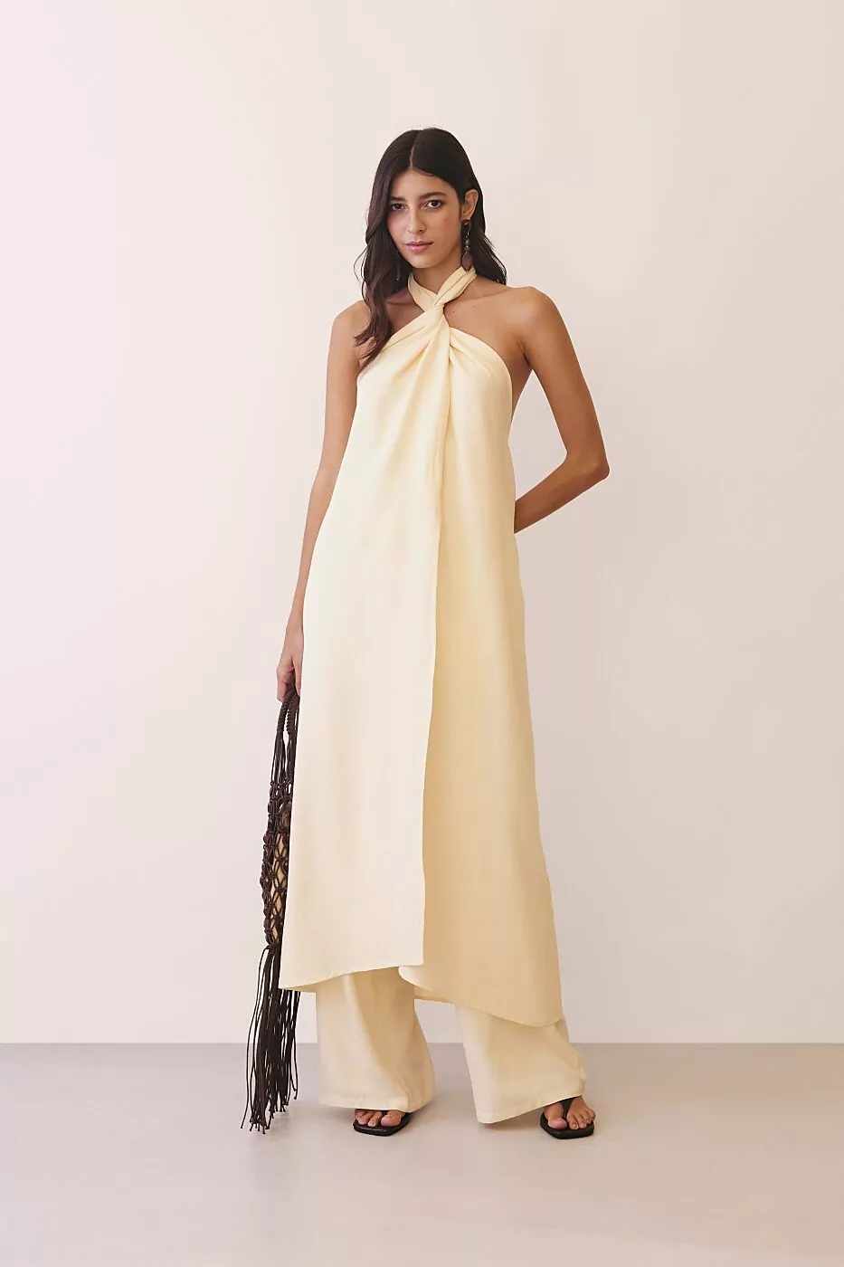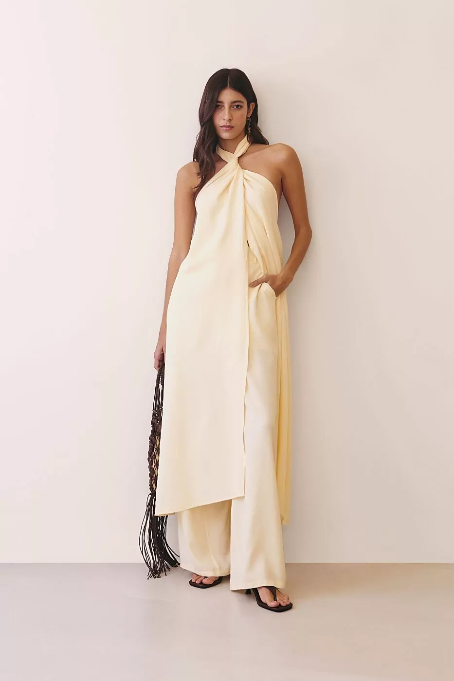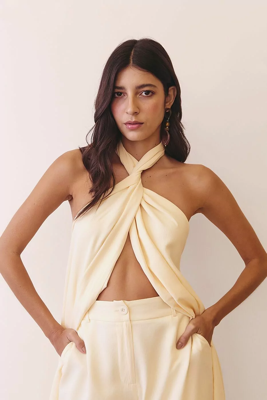 O vestido Transpasse Amarração Frente Única é uma celebração de elegância e atitude. Com seu design marcante e fluido, ele foi pensado para mulheres que gostam de se destacar com sofisticação e leveza. Confeccionado em tecido misto de viscose e poliéster, tem um caimento impecável, que acompanha o movimento do corpo com suavidade e cria uma silhueta longa e imponente. A modelagem frente única valoriza os ombros e o colo de forma sensual e refinada, enquanto a amarração no pescoço e o transpasse frontal conferem um toque contemporâneo e fluido, com abertura sutil que revela a calça interna — uma proposta moderna e surpreendente. O vermelho intenso traz força e feminilidade, perfeito para eventos, jantares ou celebrações especiais.